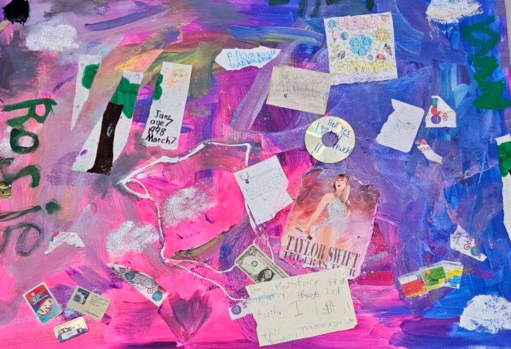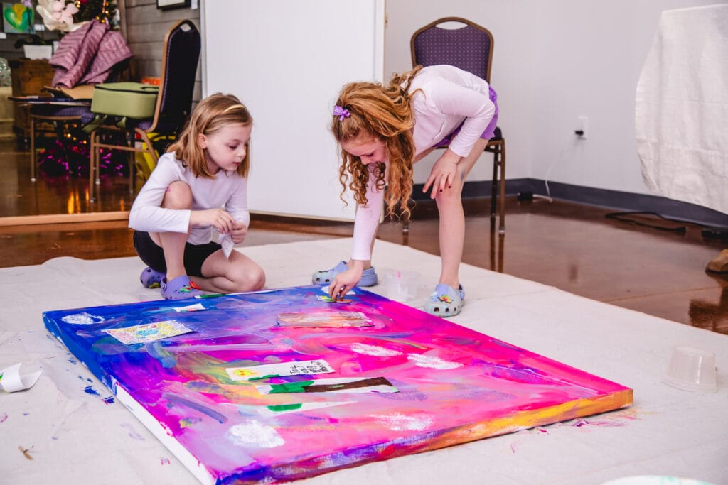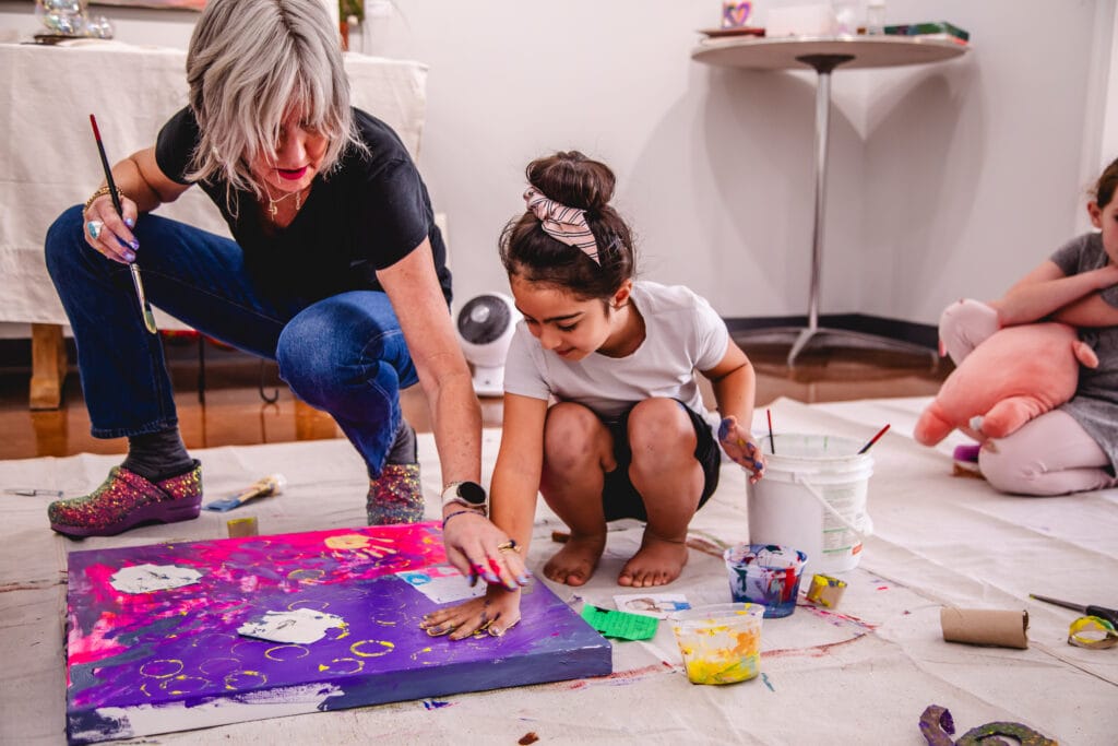 Your children (and grown-ups too, if they’d like!) are invited into the studio to play with paint, alongside me—Tiki. Big marks, little marks, laughter, and color—we’ll splash the canvas with energy and love. You’re welcome to weave in treasures: love notes, ticket stubs, old maps, photos, or anything else that tells your story.