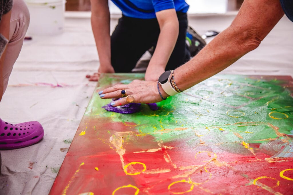 Great question! When you book your session, we will discuss colors, sizes, and add on possibilities. At your scheduled in person painting session, your group or family will start working with Tiki’s guidance on the blank canvas you choose. The fun starts as you set intentions, write them on the canvas, and then paint the base layers together. Bring any ‘momentos’ that you would like to add. This is YOUR Canvas of Memories!! You don’t need to be nervous about what is actually painted on the canvas at this point, it’s all about having fun! After the session, Tiki will discuss with you how much or how little you’d like to “show” of what your painters contributed. For instance, the final piece of artwork can have a sheer layer over some parts and others can be enveloped in layers of paint. When Tiki is working to finalize your ‘visual symphony’, she will reach out to see if you have any special requests! After all-this is YOUR Canvas of Memories! We want you to LOVE every step of the process! We will book an appointment with you to pick up your painting. Delivery is possible if you prefer.