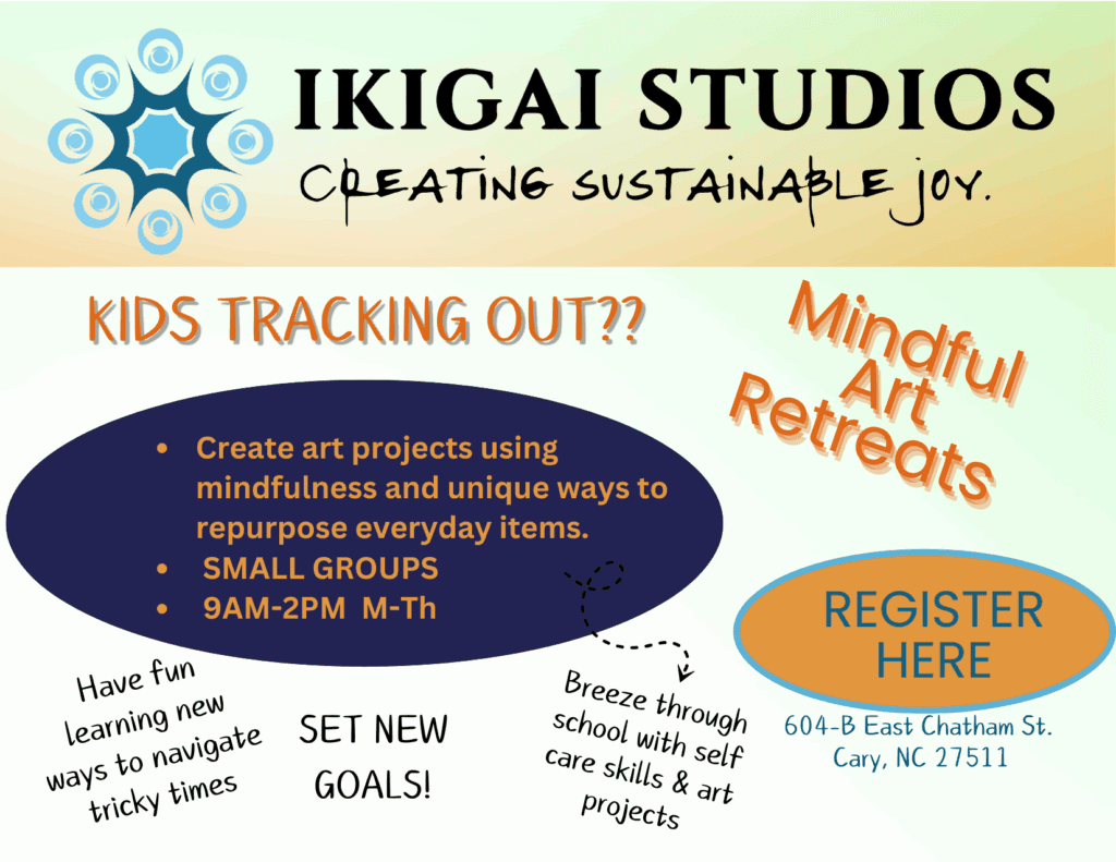Middle Schoolers will develop skills to find balance in their world & FIND THEIR IKIGAI! This is the goal! Working to find joy in the small things, stay active & live in the moment. Create & Set goals with a plan and focus on what is most important to you. Each session will be similar to the one before and build skills but will also be different from the others. We will work on incorporating our dreams and goals into art projects, use repurposed materials, paint with abandon, nurture boundaries & surroundings, breathing techniques, some basic movement & exercise techniques.